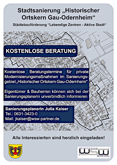 Im Rahmen des Städtebauförderprogramms “Lebendige Zentren - Aktive Stadt” unterstützt die Ortsgemeinde Gau-Odernheim private Umbau- und Sanierungsmaßnahmen im Sanierungsgebiet “Historischer Ortskern”. Eigentümerinnen und Eigentümer, die ihr Gebäude modernisieren oder umbauen möchten, können hierfür kostenlose Beratungsgespräche mit der Sanierungsplanerin Julia Kaiser in Anspruch nehmen.