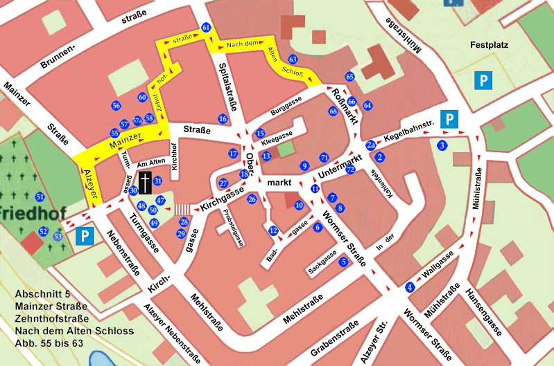 Wir biegen unterhalb des Hofes Krebs-Grode, Mainzer Straße 13, ortseinwärts links in die Zehnthofgasse ein. Im unteren Teil stieß man bei Erdarbeiten (1955) auf merowingische Gräber (um 650). Das fränkische Dorf “Odernheim = Heim des Otero” erstreckte sich von hier bis zur Westseite des Obermarktes (siehe Abb. 17). Beim Gang durch die Zehnhofstraße blickt man auf die tiefer gelegenen Gärten und Häuser der Brunnenstraße; sie liegen im ehemaligen Stadtgraben.