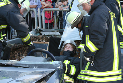 Natürlich war es nur eine Schauübung, was da am 1. Mai 2007 beim Tag der offenen Tür der Freiwilligen Feuerwehr Gau-Odernheim vor sich ging. Aber etwas Mut musste die rheinhessische Weinprinzessin Kathrin Paukner schon aufbringen, um sich in das verbeulte Auto zu setzen und dann von den Feuerwehrmännern herausschneiden zu lassen. Die bei herrlichem Frühlingswetter zahlreich erschienenen Zuschauer dankten es ihr am Ende mit viel Beifall.