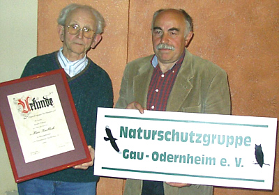 Während der Mitgliederversammlung der Naturschutzgruppe Gau-Odernheim e.V. am 12.3.2007 verlieh Vorsitzender Manfred Brunn die Ehrenmitgliedschaft an Hans Knobloch für dessen unermüdlichen Einsatz zum Schutze der Natur. Auch Gäste fanden sich zur gut besuchten Mitgliederversammlung der Naturschutzgruppe Gau-Odernheim e.V. ein, um sich über neue Ziele zu informieren und die bisherige Arbeit des neuen Vorstandes zu begutachten. Vorsitzender Manfred Brunn erläuterte die Notwendigkeit einer Regulierung des Mitgliedsbeitrages und ließ über den erweiterten Zweck des Vereins abstimmen. Neben dem “Naturschutz” ist nun auch der “Umweltschutz in der Ortslage” Zweck des Vereins, da beides sinnvollerweise zusammengehört. Er stellte das erst kürzlich fertiggestellte Schild des Vereins vor; wenn die Naturschützer vor Ort arbeiten, soll das Schild am Hänger die Öffentlichkeit erreichen. Dank für tatkräftigen Einsatz und gutes Wirtschaften ging an den alten Vorstand, der mit dem neuen Geschichtsbuch der Gemeinde und Blumen geehrt wurde. Hans Knobloch, der u.a. wesentlich dafür gesorgt hat, dass die Herkulesstaude in und um Gau-Odernheim fast vollständig ausgerottet ist, erhielt als Dank die Ehrenmitgliedschaft des Vereins. Neben dem Wildtulpenblütenfest im April, werden Vereinsmitgliedern und Bürgern demnächst Exkursionen und Diavorträge zu interessanten Themen des Naturschutzes angeboten.