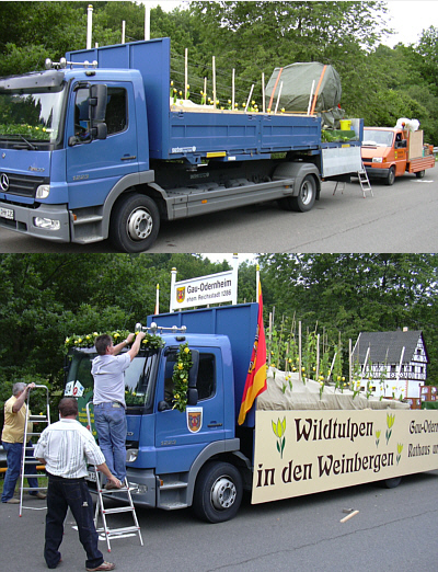 Der Rheinland-Pfalz-Tag fand in diesem Jahr vom 29. Juni bis 1. Juli in Baumholder statt. Beim großen Festumzug am 1. Juli mit 128 Zugnummern und ca. 3300 Teilnehmern wurde der Landkreis Alzey-Worms von der Ortsgemeinde Gau-Odernheim vertreten. Bereits um 7.30 Uhr startete Ortsbürgermeister Bernd Westphal mit drei Helfern Richtung Baumholder, um den von der Firma Frank - Hoffmann & Co. GmbH gestellten LKW wieder rechtzeitig in einen ansehnlichen Motivwagen verwandeln zu können.