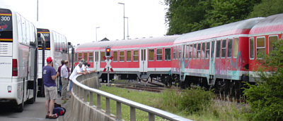 Gut gelaunt fieberte die Gruppe zusammen mit einer kleinen Delegation aus Oppenheim unter der Führung von Stadtbürgermeister Marcus Held mehr als zwei Stunden lang dem geplanten Umzugsbeginn entgegen. Doch dann entgleiste ein Wagon einen Personenzuges und blockierte den Umzugsweg