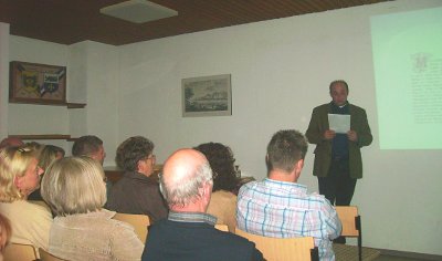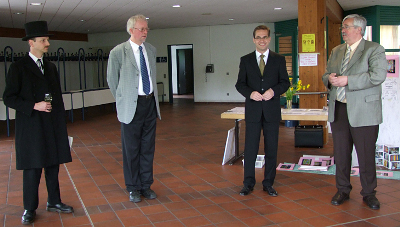 Ein äußerst umfangreiches und vielfältiges Angebot hatte der Briefmarken-Sammlerkreis Alzey am 1. Mai 2009 in der Petersberghalle aufgefahren: auf über 120 Metern Schaukastenlänge gab es Informationen und Fotos der verschiedenen Gebäude, die seit 1849 als Postexpedition, -amt, -agentur usw. dienten. In Zusammenarbeit mit dem Geschichtsverein Gau-Odernheim und dem rheinhessischen Postmuseum hatte Postexperte Jürgen Gläser weiterhin seine umfangreiche Sammlung an Postkarten und Briefen mit Ortsbezug arrangiert. Diese wurde flankiert von Exponaten über die Feldpost in den beiden Weltkriegen. Weiterer Anziehungspunkt waren die historischen Gruppenbilder der Feuerwehr, Fotos der beiden Kirchen, Konfirmandenbilder und -sprüche der letzten 100 Jahre. Nach den offiziellen Eröffnungsworten durch VG-Bürgermeister Unger und Ortsbürgermeister Westphal (Foto) würdigte Thomas Ehlenberger zeitgenössisch gekleidet als Vertreter der großherzoglich-hessischen Regierung - mit 160 Jahren Verspätung - noch die Bedeutung der Einrichtung einer Postexpedition für die zukünftige Entwicklung des Ortes. Aufgrund des schönen Wetters und des parallel stattfindenden Feuerwehrfestes konnten über 200 Besucher begrüßt werden. (te) (Foto: Mario Kasper)