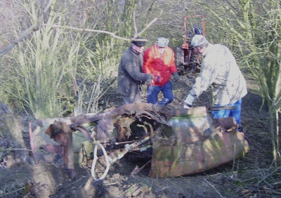 Hier war Muskelkraft gefragt, bis der Ackerschlepper die Reste des abgelagerten Autowracks herausziehen konnte. Alles in allem wurden zwei Kipper voll Altmetall aus der Landschaft geräumt.