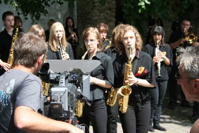 Gau-Odernheim entwickelt sich langsam aber sicher zur Mediengemeinde. Kaum war das Radio weg, kam das Fernsehen und sorgte am 4. Juli 2009 für Verkehrsbehinderungen im Ortskern. Das Interesse des SWR-Teams galt dem Blasorchester 1985 e.V. Gau-Odernheim und später der Mike Nail Band, mit denen jeweils ein musikalischer Beitrag gedreht wurde. Stundenlang wurden Kamera und Scheinwerfer aufgebaut und wieder umgebaut, gepudert, Szenen geprobt und mehrfach gefilmt, bis der Regisseur zufrieden war. Ein anstrengender, aber auch spannender Tag für das Blasorchester. Zu sehen ist das Ergebnis am 30. August 2009 im Rahmen der Sendung “SonntagsTour - Rund um Alzey”, ab 20.15 Uhr im Rheinland-Pfalz-Programm des SWR-Fernsehens. (us)