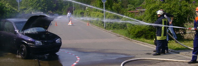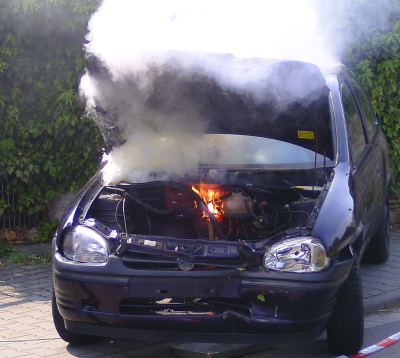 Keine Panik! Es war am 1. Mai 2009 und es war mal wieder Tag der offenen Tür bei der Freiwilligen Feuerwehr Gau-Odernheim. Auch wenn die zahlreichen Besucher, die den herrlichen Frühlingstag bei gepflegten Speisen und Getränken genossen, zunächst durch einen lauten Knall und die Flammen, die plötzlich aus dem Auto schossen, aus ihrer Feierlaune aufgeschreckt wurden, war doch Allen schnell klar, dass es sich bei dem “Unglück” nur um eine der vielen Schauübungen handelte, mit der die Freiwillige Feuerwehr sich und ihre ehrenamtliche Arbeit ihren Gästen präsentieren wollte. So waren die Flammen denn auch schnell gelöscht und das Auto konnte später noch für eine Rettungsübung eingesetzt werden. Danach war es allerdings nur noch als Cabrio zu gebrauchen. (us)