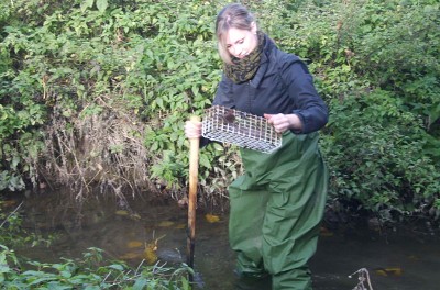 In den 70er Jahren galt die Selz als einer der meist verschmutzten Wasserläufe Deutschlands. Gilt dies heute immer noch? Dieser Frage ging die BI Umweltschutz Gau-Odernheim nach. Die Wasserqualität sollte nicht nur durch eine einmalige Probenentnahme, sondern über einen Zeitraum von 4 Wochen mit Hilfe spezieller “Passivsammler” überprüft werden. Die Messpunkte wurden nach Absprache mit Herrn Krings vom Selztalverband über den Bachlauf verteilt: von der Selzquelle bei Orbis, über Alzey, Gau-Odernheim, Bechtolsheim, Hahnheim bis nach Nieder-Olm. Das Team um Laborant Gunter Pfeiffer, der Studentin der Umwelttechnik Janine Hahne (im Bild beim Bergen eines Passivsammlers) und dem BI-Vorsitzenden Thomas Ehlenberger kümmerte sich um die Ausbringung und Einsammlung der Passivsammler. Die Auswertung führte Michael Fischer als Inhaber des gleichnamigen Umweltlabors mit einem Gaschromatographen durch.