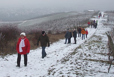 Durch letzte Schneereste arbeitete sich die Gruppe im Gänsemarsch einen ursprünglichen Hohlweg hinauf, der heutzutage kaum noch benutzt wird. Besonders die Kinder freuten sich über die Rehe und die Kaninchen, die sich zwischen den Weinstöcken in den Hängen zeigten, aber auch mancher Erwachsene sagte: “Ich bin schon ewig nicht mehr hier gewesen! Wie schön es ist!”.