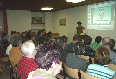 Zahlreiche Besucher konnte Dr. Konrad Arnsperger am 19. März 2011 im gut gefüllten ehemaligen Gau-Odernheimer Ratssaal begrüßen. Im Hinblick auf die Ende Mai stattfindende Feier anlässlich des Jubiläums der Stadtrechtsverleihung vor 725 Jahren hatte der Geschichtsverein einen besonderen Gast eingeladen. “Junker Thomas” entführte in zeitgenössischer Gewandung das interessierte Publikum in mittelalterliche Gefilde. Anhand von Bildern wurden zunächst die Lebensumstände in Dorf und Stadt aufgezeigt. Von der politischen “Großwetterlage” im damaligen heiligen römischen Reich deutscher Nation wurde der Bogen geschlagen zu den lokalen Auseinandersetzungen und Machtkämpfen in unserer näheren Heimat. Anschaulich wurde die Bedeutung der Reichsfreiheiten und Stadtrechte für die Expansion und Blüte des Ortes ab 1286 aufgezeigt. Nicht ausgespart wurden auch die ab dem 14. Jahrhundert erfolgenden Verpfändungen Odernheims, der Bürgeraufstand von 1579 und die folgenden ständigen Zerstörungen durch Feuersbrünste und Kriege. Durch gezielte Fragen wurden die Zuschauer in den Vortrag eingebunden und so manche Diskussion setzte sich nach dem Ende des offiziellen Teils bei einem guten Gau-Odernheimer Tropfen noch fort. (te)