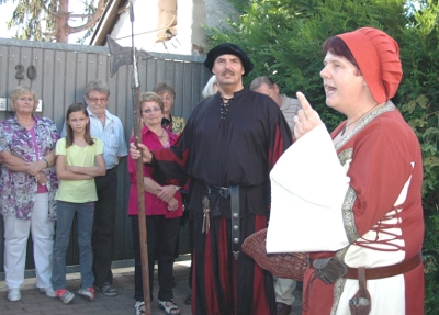Mit dieser Szene endete eine Ortsführung der etwas anderen Art, zu welcher der Geschichtsverein am Marktsamstag eingeladen hatte. Statt der erwarteten 30 Besucher geleitete Junker Thomas (Ehlenberger) mehr als die dreifache Anzahl Gäste durch den alten Ortskern. Unterwegs traf die Gruppe auf verschiedene Gewandete, die in kleinen Spielszenen historische Themen aufgriffen, welche dann den Zuschauern erläutert wurden.