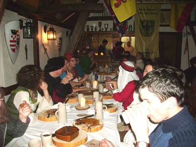 Zunächst wurden von holden Maiden Schüsseln und Handtücher gereicht, damit die Gäste sich ihre Hände waschen konnten. Die Burgherrin Claudia begrüßte alsdann die illustre und zumeist gewandete Schar mit launigen Worten, heimgeleuchtet und bewacht von ihrem Gesinde. Während die Mundschenke für Nachschub an Gerstensaft und Wein sorgten, wurden erlesene Köstlichkeiten verschiedenster Art gereicht. Zwischen den einzelnen Gängen erfreute Theoderich Nêmmersatt das schmausende Volk. Der selbsternannte “unfugigste unter den Spielleuten” begeisterte in Begleitung seiner “Alten” mit derben und lustigen Weisen zum Spiel seiner Drehleier. Keiner unter den Gästen, der an diesem Abend nicht begeistert mitging, obwohl mancher auch "sein Fett weg" bekam. Die Stimmung war auf dem Siedepunkt und erst nach mehreren Zugaben wurden die Spielleute unter stehenden Ovationen entlassen. Abschließend bedankte sich Junker Thomas bei den Recken und Maiden des Bürgervereins für die perfekte Veranstaltung und freute sich auf eine weiterhin gute Zusammenarbeit. (te)