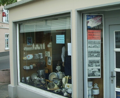 Handel und Gewerbe waren neben dem Handwerk seit dem Mittelalter die prägenden Säulen einer städtischen Gesellschaft. Durch die Verleihung der Stadtrechte am 16.04.1286 durch König Rudolf und den folgenden Ausbau erlebte das vormalige Dorf Otternheim einen rasanten Aufschwung. Die damalige Reichsstadt Odernheim bot nicht nur an den großen Jahrmärkten ein vielfältiges Warenangebot, sondern auch diverse Ladengeschäfte. Das älteste dieser Art findet sich im Anwesen Untermarkt 6 im Besitz von Werner Boos. Seit über 150 Jahren wurden hier von den Familien Dürkes, Ritter, Hofmann und Boos neben “Kolonialwaren” u.a. Geschirr und Metallwaren verkauft. Aus Anlass des Stadtrechtsjubiläums hat eine Arbeitsgruppe des Geschichtsvereins einen Teil des Ladens in seine Entstehungszeit zurückversetzt. Die originale Einrichtung aus den 1950er Jahren wurde mit zahlreichen Leihgaben aus der Bevölkerung liebevoll dekoriert und bietet einen authentischen historischen Rückblick. Schauen Sie doch einfach beim nächsten Sonntagsspaziergang mal an diesem “Museumsschaufenster” vorbei. (te)