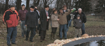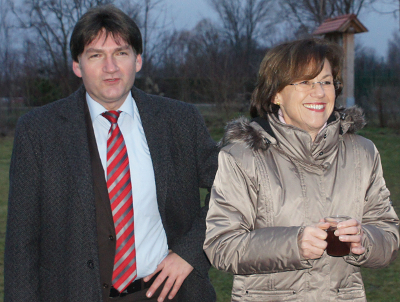 Es fing schon an zu dämmern als Umweltministerin Margit Conrad am späten Nachmittag des 20. Januar den Naturerlebnisplatz der Naturschutzgruppe Gau-Odernheim e.V. betrat. In grünen Gummistiefeln als Schutz gegen das weiche Erdreich und in dicker Steppjacke zum Schutz gegen die winterliche Kälte, wurde sie von den wartenden Bürgern mit einer Tasse heißem Tee herzlich begrüßt. Vereinsvorsitzender Manfred Brunn freute sich, dass neben seinem kompletten Vorstand und vielen Mitgliedern auch Bürgermeister Bernd Westphal, Altbürgermeister Karlheinz Merker, Erster Beigeordneter Heiner Illing, TSV-Vorsitzender Gerhard Zibell und MdL Heiko Sippel dem Ruf der Ministerin gefolgt waren.