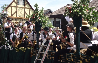 Die Gruppe mit dem längsten Wagen: Die “Dorfmusikanten” vom Blasorchester 1985 e.V. Gau-Odernheim.