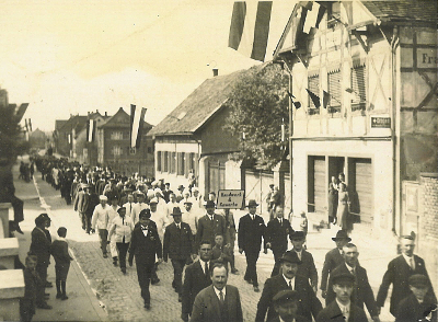 Nach einer genauen Untersuchung des nebenstehenden Bildes konnte die Anklage jedoch zurückgezogen werden. Im Jahre 1906 eröffnete Franz August Sommerfeld in der Mainzer Straße ein Warenhaus mit Kolonialwaren, Lacken, Chemikalien und - Drogen, wie auf einem Blechschild rechts am Laden zu lesen ist. Als “Drogen” wurden verschiedene Heilkräuter, Tinkturen, Körperpflege- und Putzmitteln gehandelt, ähnlich dem Sortiment einer heutigen “Drogerie”. Über Jahrhunderte hinweg konnte man solche Mittel nur in Apotheken erwerben, erst nach der Reichsgründung wurde der Betrieb von Drogerien genehmigt. Beeindruckend auch eine perfekt erhaltene, über 100 Jahre alte Verkaufstüte für ein Feinwaschmittel, die Manfred Hartmann an diesem Abend stiftete. Sommerfelds Tochter Juliane (bekannt als “Sommerfelds Julche”) führte das Geschäft noch bis Ende der 1960er Jahre weiter. Das vorliegende Foto datiert auf den 1.Mai 1933, wobei es sich bei den Menschenmassen nicht um “Drogenkunden”, sondern um Teilnehmer des Umzugs zum “Tag der Arbeit” handelt.