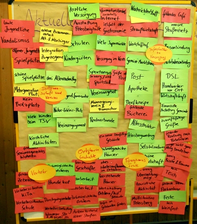 Nach einer Einführung in das Thema “Dorferneuerung” durch Frau Franzen bestand der erste Teil der Veranstaltung aus dem Sammeln der Stärken und Schwächen von Gau-Odernheim und Gau-Köngernheim. Dank der regen Beteiligung der Anwesenden konnte dieses Thema mit einer ausführlichen nach Themen geordneten Sammlung von grünen und roten Kärtchen pünktlich zur Erfrischungspause abgeschlossen werden.