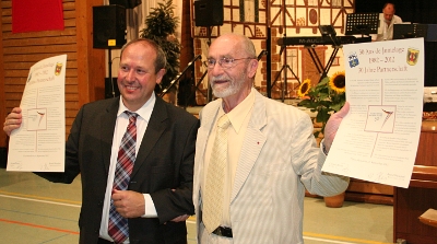 Am Abend hatte die Gemeinde dann in der Petersberghalle zu den offiziellen Feierlichkeiten eingeladen. Beigeordneter Heiner Illing begrüßte die Gäste zweisprachig und führte auch durch den Abend. Dieser Abend wird allen Beteiligten lange in Erinnerung bleiben. Zunächst konnte man sich am kalt-warmen Buffet bei den Klängen der Gruppe Witzun stärken. Bei der musikalischen Umrahmung des Abends begeisterte die Gau-Odernheimer Französisch-Singgruppe “Les Chanteuses” von Madame Diligent. Daneben zeigten aber auch der gemischte Chor des MGV, sowie das Blasorchester mit Jugendorchester ihr exzellentes Können. Dazwischen waren die Grußworte der Bürgermeister und des Landrates eingebettet. Hier wurde auf den enormen Stellenwert der Deutsch-Französischen Freundschaft und die historischen Hintergründe hingewiesen. Besonders stolz sind wir in Gau-Odernheim, dass hier die Partnerschaft nicht nur auf dem Papier besteht, sondern in den Schulen und von den Bürgern aktiv gelebt wird. Als besondere Ehrengäste konnte neben Freunden und Teilnehmer der ersten Stunde auch der “Geburtshelfer” der Partnerschaft Herr Hempel aus Armsheim begrüßt werden. Den Höhepunkt bildete die Unterzeichnung der Urkunde zur Erneuerung des Partnerschaftsversprechens und der Austausch der Gastgeschenke. In Pulnoy kann man sich in Zukunft an einem Deutschen Straßenverkehrsschild nach Gau-Odernheim orientieren. Im Gegenzug wird in Gau-Odernheim ein Schild für einen “Partnerschafts-Platz” aufgestellt. Zur Erinnerung konnten die Teilnehmer des Abends einen bedruckten Partnerschafts-Schal und eine Kopie der Partnerschaftsurkunde mit nach Hause nehmen.