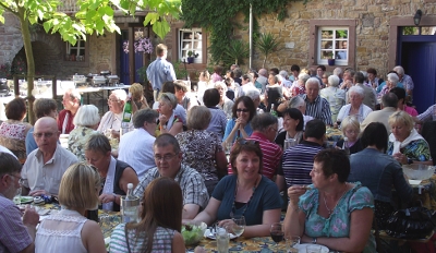 Der Sonntag war dann ganz dem gemeinsamen Ausflug gewidmet. Nach dem Frühstück in den Gastfamilien ging es mit dem Bus ins mittelalterliche Neuleiningen in der Pfalz. Bei herrlichem Wetter stärkte sich die gemischte Deutsch-Französische Reisegruppe im historischen Innenhof der Felsenmühle an einem original Pfälzer Buffet.