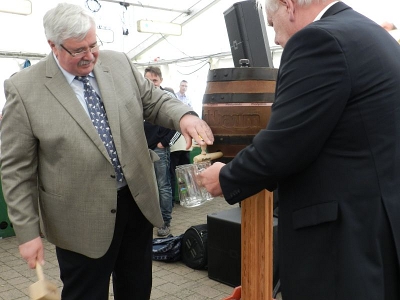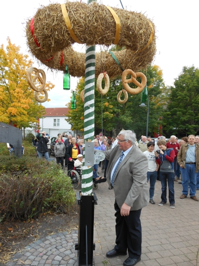 Zur offiziellen Eröffnung am Samstag Nachmittag begrüßte Bürgermeister Westphal beim Hochziehen des Kranzes zahlreiche Gäste auf dem Platz vor der Petersberghalle.