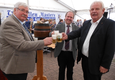 Vorher galt es, in der stilvoll zum Volksfestgelände umdekorierten und gut gefüllten Petersberghalle erst einmal ausgiebig zu feiern. Musikalisch umrahmt vom Musikzug der Freiwilligen Feuerwehr Bechtolsheim e.V. und vom Musikverein 'Cäcilia' Monzelfeld 1926 e.V. wurde das Oktoberfest von Ortsbürgermeister Bernd Westphal offiziell mit dem Bierfassanstich eröffnet; was allerdings wegen eines nicht passenden Zapfhahns erst im zweiten Anlauf gelang. Für reichlich Stimmung sorgten anschließend die Steinachtaler, eine Ausgründung der beliebten Mike Nail Band. Die reichhaltige Verpflegung durch die zahlreichen Helfer des Blasorchesters trug zudem dazu bei, dass die Zeit bis zum Höhepunkt des Abend, der Siegerehrung, wie im Fluge verging.