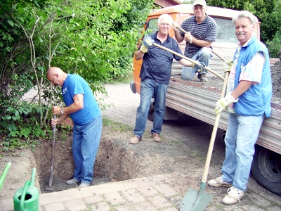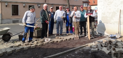 Nachdem im letzten Jahr der Versuch unternommen wurde, den Baum sowie die noch verbliebene Bepflanzung zu retten – was leider nicht möglich war, wurde die Fläche jetzt grundlegend überholt. Die Rentnerbande entwickelte die Idee, den abgestorbenen Baum, die marode Holzbank, den zerstörten Papierkorb und die verdorrten Sträucher komplett zu entfernen und den so genannten “Pflanzstreifen” zu pflastern.