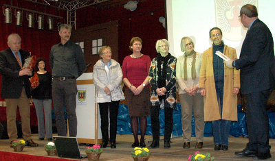 Für im Ehrenamt außergewöhnlich aktive Bürgerinnen und Bürger, die über das in der Ehrensatzung definierte Punktesystem nicht in der Lage sind eine entsprechende Ehrung zu erhalten, hat die Ortsgemeinde die bronzene Ehrennadel geschaffen. Ausgezeichnet mit dieser Ehrung wurde Franz-Josef Schefer für sein fast 50-jähriges Wirken als Organist, Dirigent und Ideengeber in den Gau-Odernheimer Kirchen. Ebenso Heiner Becker, der das Gau-Odernheimer Wappen im Feuerwehrkreisel und in der Zwischenzeit sogar noch ein Wappen von Pulnoy und der Feuerwehr geschaffen hat. Zuletzt wurde noch Jürgen Gläser für sein Engagement im Sammeln zu allem was mit der Gau-Odernheimer Postgeschichte zu tun hat, sowie dem Organisieren von Postausstellungen und Jürgen Boller für die jahrzehntelange Pressearbeit, dem Archivieren zu allem was es in den Medien zu Gau-Odernheim gibt und dem Erstellen von Chroniken gedankt. Zum Abschluss waren noch alle Besucher und Geehrten zu einem Umtrunk und Imbiss geladen, bei dem viel über das Vergangene und Bevorstehende diskutiert wurde.
