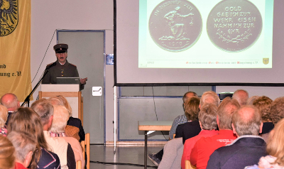 … lautete der Titel des diesjährigen Marktvortrags des Geschichtsvereins. Thomas Ehlenberger war in Rolle und Uniform seines Urgroßonkels Johann Weber geschlüpft, um dem interessierten Publikum einen Blick in die Zeit des Umbruchs vor 100 Jahren zu ermöglichen. Aufgrund des großen Andrangs an Zuhörern mussten im Foyer der Petersberghalle weitere Stuhlreihen aufgestellt werden. Neben der Weltgeschichte rund um das Kriegsende wurden zahlreiche bisher unveröffentlichte Aufnahmen aus privaten Fotoalben gezeigt, die Not und Entbehrungen an der Heimatfront zeigten, neben der Fliegerbeobachtungsstelle auf dem Petersberg z.B. auch nordafrikanische Besatzungstruppen. Eingestreut wurden auch verschiedene zeitgenössische Reden, die von Aktiven des Geschichtsvereins im Publikum vorgetragen wurden. Neben der Bauersfrau, die den Brief an ihren Mann im Felde vorlas, kamen Philipp Scheidemann und Karl Liebknecht zu Worte, die am 09.11.1918 die Republik ausriefen, aber auch Marie Juchacz, die nach Einführung des Frauenwahlrechts 1919 weltweit erste weibliche Parlamentarierin, durfte ihre Premierenrede halten. Nach dem Vortrag wurde noch lange zusammengestanden und bei einem Gläschen Wein über das Gehörte diskutiert. (te)