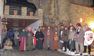 … so ließ sich vergangenen Freitag und Samstag die Stimme des Oremer Nachtwächters vernehmen, stimmgewaltig intoniert durch Wolfgang von Wiebel. Der Geschichtsverein Gau-Odernheim hatte geladen und Dutzende Pilger aus nah und fern waren der Einladung gefolgt. Groß und Klein, viele auch mit Laternen ausgerüstet lauschten den Ausführungen von Junker Thomas, der die Gäste in das Jahr 1618 zurückversetzte. Eine ob der Kälte bibbernde Pilgergruppe auf dem Wege nach Santiago de Compostela suchte eine Herberge für die Nacht und nahm darum das Angebot gerne an, dem Nachtwächter bei seiner Runde zu folgen, die an allen 11 Gasthäusern vorbeiführen sollte. Hierbei erfuhren die Pilger so manche Neuigkeit, über fortschrittliche Einrichtungen wie das öffentliche Badehaus und die Probleme mit den “Bademädchen”, die innovative Entsorgung sanitärer Abwässer oder die Effizienz der damaligen Postzustellung. “Hochgeistige” Hilfe bei der Kälte brachten die Kingeremer Ritter, die auf dem Weg zu den Stadttoren Einiges zu berichten hatte. Auch konnte das Geheimnis des immer wieder über den Weg schwebenden Geistes der Eva von Gerau gelüftet werden. Als fulminanten Abschluss erwartete die Gruppe eine beeindruckende Feuerschau durch den Gaukler Alexander von Wiebel, bevor im Burghof der Abschluss zelebriert werden konnte. Junker Thomas bedankte sich bei allen Darstellern und Helfern, ohne die eine solche Veranstaltung gar nicht durchführbar wäre, bei “Pferdeknecht” Johanna Weber nebst Roß, Familie Bellenberg für die spontane Spende von Speis und Trank, Selztalbrennerei Boos für die “geistige” Unterstützung und die Burgherren Manfred und Anita Einsfeld. Laut einhelliger Meinung der Besucher sollte dies nicht die letzte Veranstaltung dieser Art gewesen sein. (te)