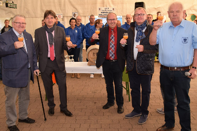 Eine weitere Gästegruppe nutzte den rustikalen Fahrdienst (neudeutsch: Shuttle-Service) mit Traktor und Anhänger zum Lieberg. Der Rest nahm an einem kurzen Rundgang durch das historische Gau-Odernheim teil. Als Nebeneffekt konnten die französischen Freunde in der Petersberghalle den Markt “Frühlingstage im Alzeyer-Land” (40 Aussteller) besuchen. Verkaufsschlager für die Gäste waren – frische Spargeln!
