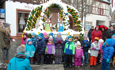 Zur Aufstellung der Osterkrone hatten die Gau-Odernheimer Landfrauen schon schönsten Sonnenschein, Kälte und Regen – aber Schnee, das war ein Novum… Zahlreiche Besucher ließen es sich aber trotzdem nicht nehmen bei der Feierstunde zum Aufstellen der Osterkrone auf dem Obermarkt dabei zu sein. Die Kinder der Kindertagesstätte Regenbogen ließen mit Ihren Frühlingsliedern aber schon einmal etwas Frühlingsstimmung aufkommen und erinnerten daran, dass trotz Schnee und Eis der Frühling unmittelbar bevorsteht. Landfrauen-Vorsitzende Sigrid Bungert-Müller erläuterte die Tradition der Osterkronen, die viele Jahrhunderte zurückreicht, zwischenzeitlich fast verschwunden war aber seit einigen Jahren eine Renaissance erlebt - so auch in Gau-Odernheim. Seit fast zwei Jahrzehnten binden und schmücken die Gau-Odernheimer Landfrauen jedes Jahr eine schönere Osterkrone, die ihren festen Platz auf dem Brunnen auf dem Obermarkt hat. Aus jedem Blickwinkel offenbart sich ein anderes Bild und gibt es etwas zu entdecken. Ortsbürgermeister Heiner Illing dankte den Landfrauen für diese Unterstützung zur Ortsverschönerung und im Anschluss gab es im Rathaus noch das gut besuchte Ostercafé der Landfrauen mit leckeren selbst gebackenen Kuchen und heißem Kaffee und Kakao zum aufwärmen.