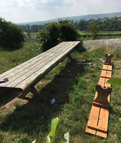 In der Nacht vom 8. auf den 9. Juni 2018 beschädigten Unbekannte am Tisch des Weines am Herrgottspfad aus unerfindlichen Gründen und in blinder Zerstörungswut Mobiliar und vermüllten die gesamte Umgebung. Die Arbeit von Idealisten, die in mühevoller ehrenamtlicher Arbeit in ihrer Freizeit einen Bereich zum Verweilen und Feiern geschaffen haben, wird hier im wahrsten Sinne des Wortes mit Füßen getreten. Schon längere Zeit häufen sich die Vorfälle, dass Flaschen und Müll zum Ärger der Winzer in den Weinbergen landen. Aber dieser Vorfall stellt alles bisher da gewesene in den Schatten. Wahrscheinlich kamen die Übeltäter aus einem Kreis von ca. 50-100 Jugendlichen im Schulalter aus der gesamten Umgebung, die am Freitag bereits ab 17 Uhr im Bereich REWE-Parkplatz – Kreisel eine “Sauf”-Party veranstalteten. Gegen 21 Uhr meldeten Kinder, die an der zeitgleich stattfindenden Skaternight teilnahmen, dass im Bereich Kreisel alles voller Glasscherben und Müll sei. Tatsächlich mussten die Veranstalter der Skaternight auf ca. 50 Meter Glasscherben, zahlreiche Schnapsflaschen, “Ballermann”-Strohhalme und Rot-Weiße Plastiktrinkbecher einsammeln – alles in allem zwei große Müllsäcke voll Dreck… Die betrunkenen und torkelnden Jugendlichen wiesen jedoch jede Schuld von sich. Die umgehend informierte Polizei meinte jedoch, dass aufgrund von anderen Veranstaltungen niemand frei wäre, um sich der Sache anzunehmen. Leider bestand somit auch keine Gelegenheit Personalien aufzunehmen (da dies nur die Polizei und das Ordnungsamt dürfen und das Ordnungsamt um diese Zeit nicht mehr erreichbar ist, bleiben die Gemeinden somit ohne Hilfe auf sich selbst gestellt). Nach Einbruch der Dunkelheit löste sich die Versammlung dann auch auf. Da am beschädigten Tisch des Weines aber nun die gleichen Flaschen, Becher und Trinkhalme zu finden waren, ist davon auszugehen, dass es sich hier um die gleichen “Übeltäter” handelt. Falls jemand etwas gesehen hat oder zur Aufklärung beitragen kann, so soll er sich bitte bei der Polizei in Alzey melden. Es wäre schade, wenn am Schluss der Tisch des Weines und das gesamte Mobiliar wieder abgebaut werden und den Freizeitwanderern eine beliebte Möglichkeit der Rast genommen werden muss.