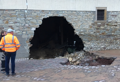 In der Nacht von Freitag auf Samstag (25./26. Oktober) ist in der Alzeyer-Nebenstraße das 150mm PVC-Rohr der Hauptwasserleitung gerissen. Hierdurch strömten in kürzester Zeit mehrere Hundert Kubikmeter Wasser in den Straßenuntergrund, unterspülten die Straße und drangen in den Keller des benachbarten Scheunengebäudes ein. In Folge stürzten sowohl ein Teil der Scheunenmauer, als auch die Straßendecke ein und Wasser sowie Schlamm fluteten einen Teil der Kirchgasse. Eine in den frühen Morgenstunden von den Geräuschen alarmierte Nachbarin informierte umgehend Polizei und Feuerwehr, womit wahrscheinlich schlimmeres verhindert wurde. Die Wasserversorgung Rheinhessen-Pfalz, Feuerwehr und THW waren den ganzen Tag im Einsatz um die Havarie zu stoppen, überflutete Bereiche auszupumpen und das einsturzgefährdete Gebäude zu sichern. Die Gemeindearbeiter sorgten durch das Aufstellen von Bauzäunen für die Sicherheit des gesamten Bereiches. In den nächsten Tagen muss nun geprüft werden, wie es mit dem Gebäude und den Schäden weitergeht. Wenn Sie im betroffenen Gebiet wohnen und Wassereinbruch in Ihrem Keller oder andere ungewöhnliche Veränderungen feststellen, melden Sie sich bitte umgehend bei der WVR in Bodenheim. Der Straßenbereich Alzeyer-Nebenstraße – Kirchgasse muss wahrscheinlich für längere Zeit gesperrt werden. Ich bedanke mich an dieser Stelle bei allen Helfern und Beteiligten, sowie der Nachbarschaft für die hervorragende Unterstützung und den reibungslosen Ablauf in dieser außergewöhnlichen Situation.