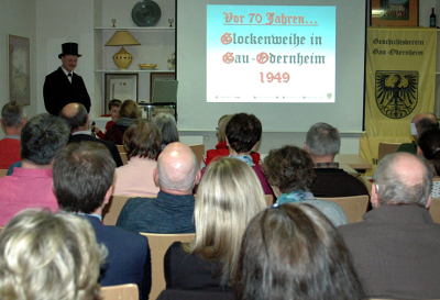 Zahlreiche Besucher waren der Einladung des Geschichtsvereins gefolgt und lauschten den Ausführungen über die bewegte Geschichte des Gau-Odernheimer Kirchengeläuts in den vergangenen Jahrhunderten. Zunächst gab es allgemeine Informationen über die Vorgehensweise beim Guss von Glocken und die Bedeutung des weltlichen und kirchlichen Geläuts. Im Anschluss wurde auf die 4 Glocken des alten romanischen Kirchturms eingegangen, der 1799 während eines Gottesdienstes einstürzte und 7 Männer erschlug. Auch der heutige, 1833 fertiggestellte Kirchturm mit seinen 3 Glocken war vom Schicksal gebeutelt, wurde des Öfteren vom Blitz getroffen und verlor mehrfach sein Geläut, durch Zerspringen von Glocken oder durch Einschmelzen in beiden Weltkriegen. Umso beeindruckender war die Tatsache, dass bereits 1949 also kurz nach Kriegsende und direkt nach der Währungsreform durch eine enorme Spendenbereitschaft der Bevölkerung wieder neue Glocken angeschafft werden konnten. Etliche Aufnahmen einer beeindruckenden Prozession, die die Glocken 1949 vom Bahnhof zur Kirche geleiteten, boten Stoff für interessante Gespräche, die auch im Anschluss an den offiziellen Teil noch fortgeführt wurden. (te)